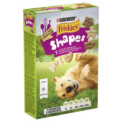 Τα Friskies Shapes είναι μια διασκεδαστική ποικιλία από υγιεινά και νόστιμα μπισκότα που σας βοηθούν να διατηρείτε το σκύλο σας σε φόρμα. Τα ψημένα στο φούρνο Friskies Shapes δεν είναι μόνο νόστιμα: αποτελούνται από συστατικά υψηλής ποιότητας και συνεισφέρουν στις ημερήσιες διατροφικές απαιτήσεις του σκύλου σας. Τα Friskies Shapes είναι ιδανικά για όλες τις περιστάσεις: ως διατροφικό συμπλήρωμα του κυρίως γεύματος, ως λιχουδιά ή ως επιβράβευση κατά την εκπαίδευση.